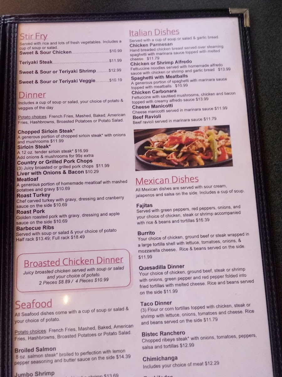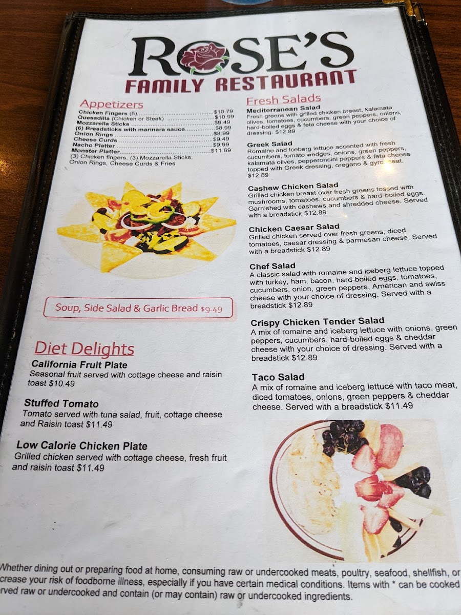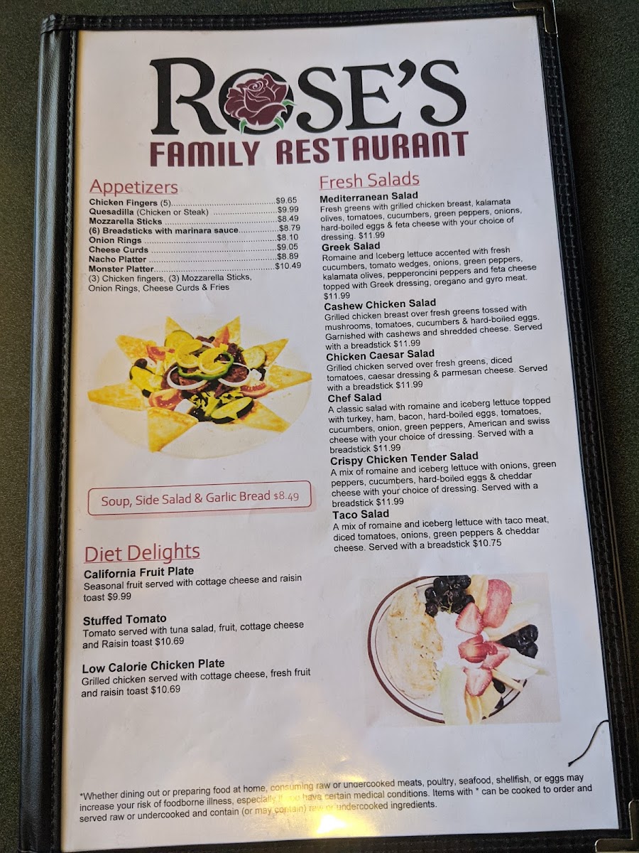 Welcome to Rose's Family Restaurant, a delightful dining gem located at 312 Center Dr, Luxemburg, WI. This family-style restaurant boasts a diverse menu that caters to a variety of tastes, ensuring every guest finds something to savor. Enjoy hearty dinner sides like bowl chili and baked potatoes, perfect for any appetite. The salads and diet delights include fresh options like the Taco Salad and Low Calorie Chicken Plate, blending health and flavor seamlessly.